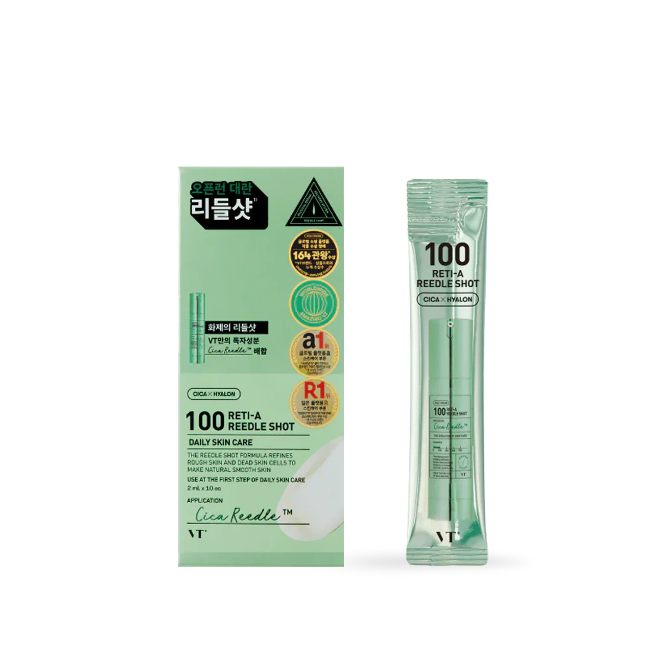 VT Cosmetics Reti-A Reedle Shot 100 is a targeted skin treatment designed to improve texture, brighten the complexion, and support smooth, clear skin. Each pouch contains a 2ml single-use serum stick, making application clean, fresh, and convenient. The formula combines Retinol with gentle micro-reedle spicules that help the product absorb deeper into the skin, encouraging cell renewal and effective treatment of dark spots, acne marks, fine lines, and uneven surface texture.